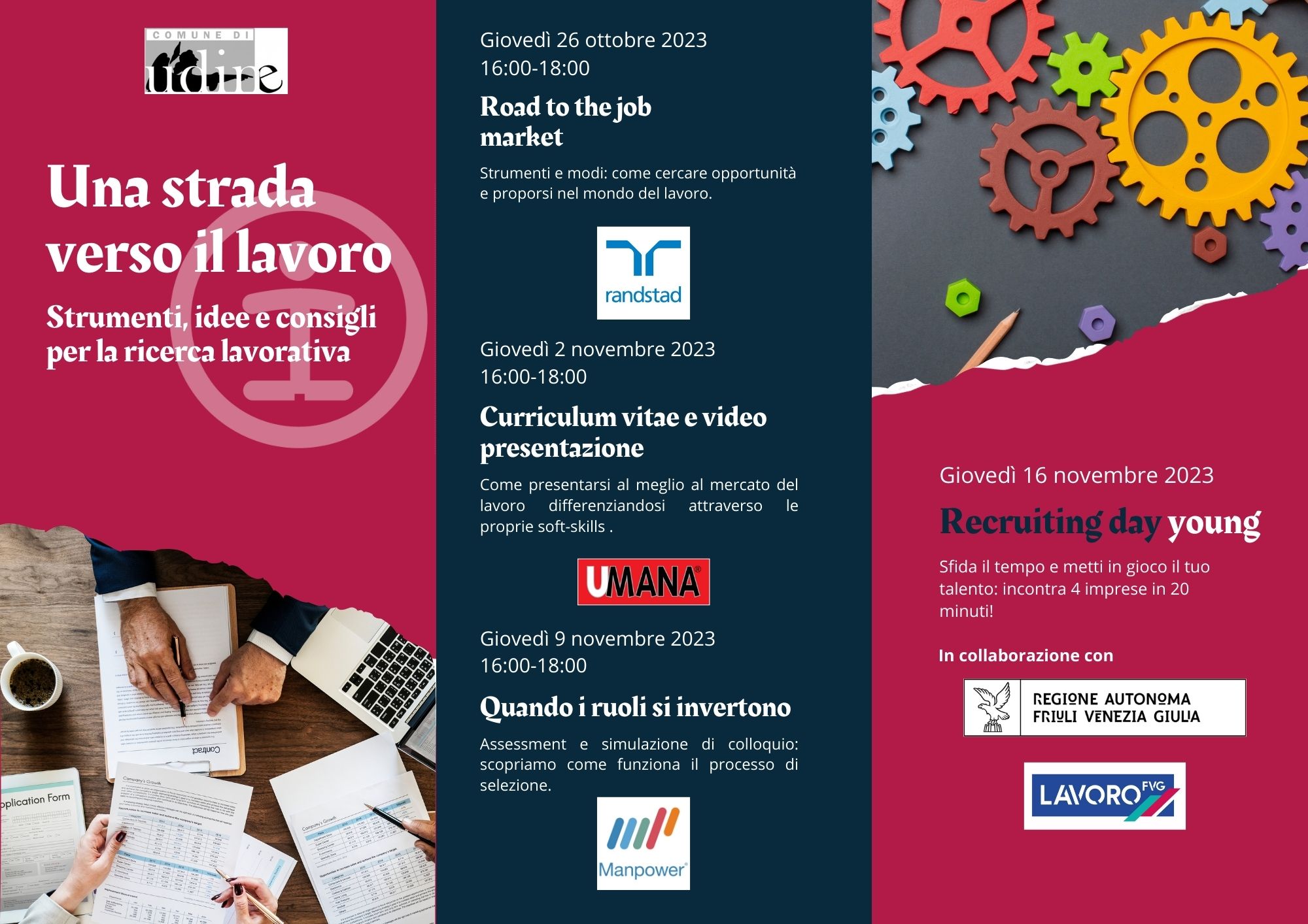 Scegli se partecipare ad uno o più incontri tra quelli proposti e a seguire, Giovedì 16 novembre, metti immediatamente alla prova ciò che hai imparato in occasione del Recruiting day young organizzato in collaborazione con la @regionefvg