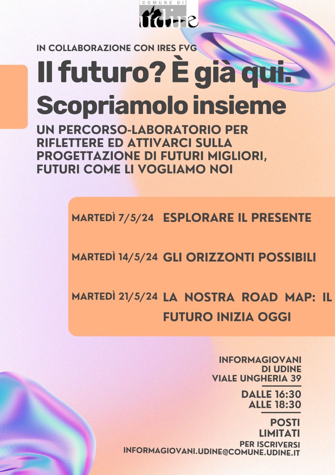 Gli interventi saranno tenuti da una formatrice e un formatore specializzati in future foresights per tre martedì consecutivi, 7, 14 e 21 maggio dalle 16:30 alle 18:30 all'IG.