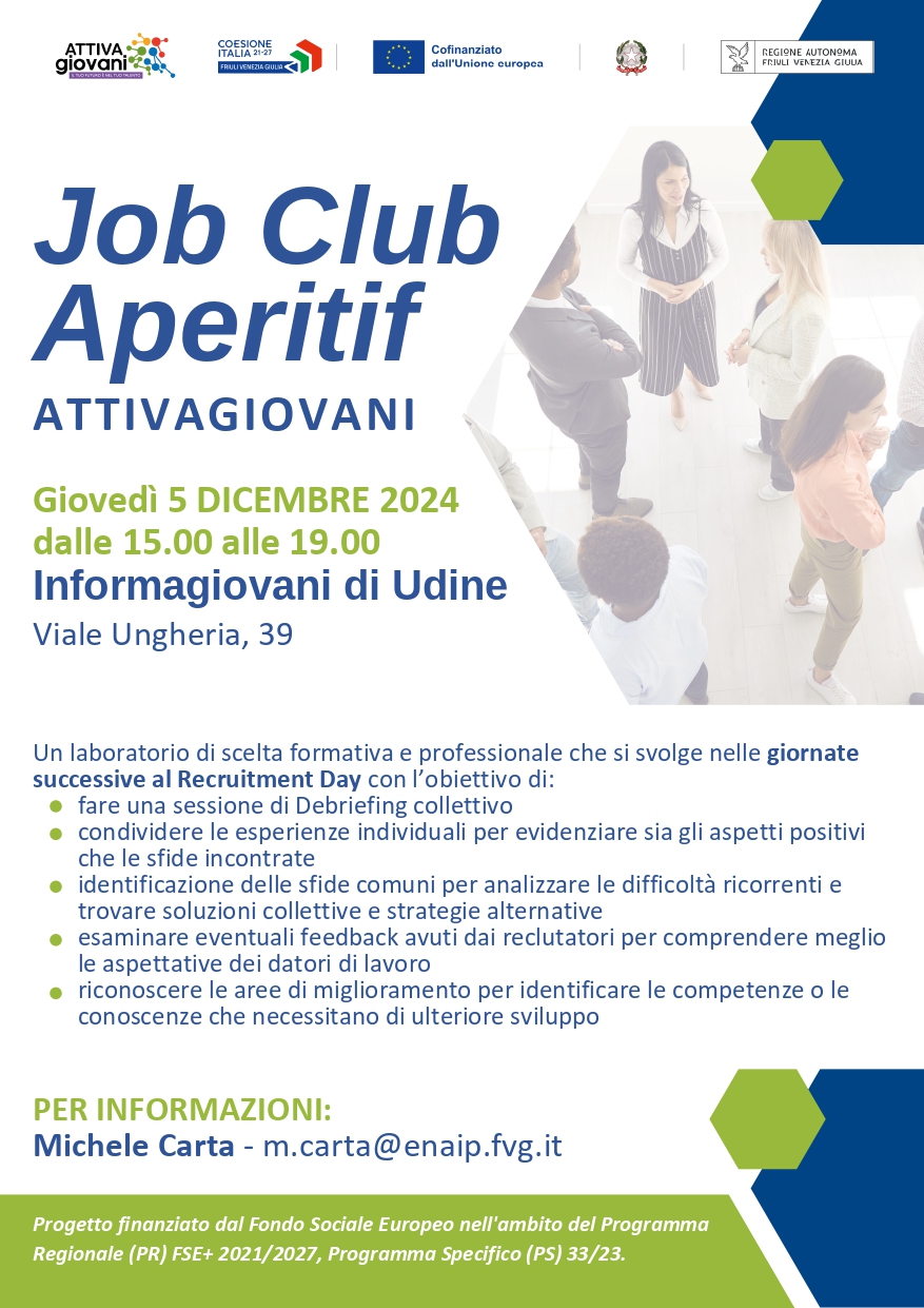 Giovedì 05 Dicembre 2024 dalle ore 15:00 alle ore 19:00 presso l'InformaGiovani di Viale Ungheria 39, 33100 Udine, si terrà un laboratorio di scelta formativa e professionale post "Recruiting Day" con l'obiettivo di: