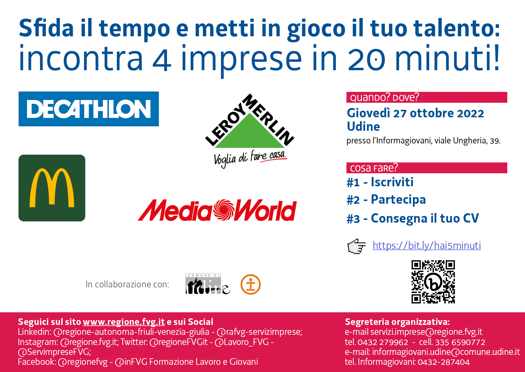 Arriva il Recruiting Day Young: il 27 ottobre 2022 a Udine è in programma una giornata in cui i giovani under 35 sono invitati a sperimentarsi in 20 minuti con 4 colloqui di reclutamento di personale con importanti aziende particolarmente attente ad un organico giovane. Lo organizza la Regione Friuli Venezia Giulia, attraverso i Servizi per il lavoro, insieme all’Informagiovani - Comune di Udine in Viale Ungheria, 39.